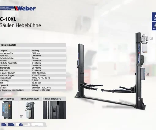 Die 2 Säulen Hebebühne Weber Expert Serie SJC-10XL überzeugt durch ihre hohe Belastbarkeit, moderne Sicherheitsfunktionen und eine robuste Bauweise, die sie ideal für den professionellen Werkstattalltag macht. Dank der stabilen Konstruktion und der einfachen Bedienung eignet sich diese 2 Säulen Hebebühne perfekt für Reifenservice, Karosserie- und Reparaturarbeiten. Besonders geschätzt werden die schnelle Hubzeit und die zuverlässige Technik, die für maximale Effizienz sorgen. Neben der Expert Serie bieten wir auch die 2 Säulen Hebebühne Weber Klassik Serie QSD-4000A an, die sich ebenfalls durch ihre Langlebigkeit und Benutzerfreundlichkeit auszeichnet. Beide Modelle garantieren höchste Qualität und sind eine ausgezeichnete Wahl für Werkstätten, die Wert auf Sicherheit und Leistung legen.