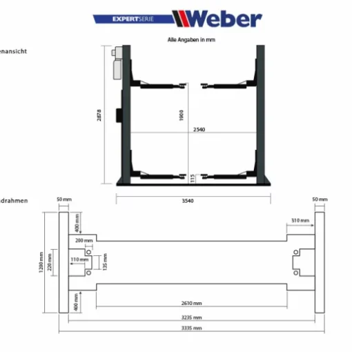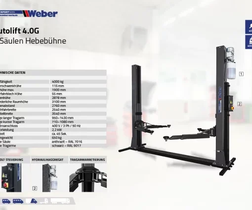 Die 2 Säulen Hebebühne 4.0G der Weber Expert Serie lässt sich dank des stabilen Grundrahmens auch auf Betonböden mit einer minimalen Dicke von 150 mm installieren. Durch die asymmetrischen Tragarme und die große Durchfahrbereite kann die Bühne für das Heben von PKW und kleinen Transportern verwendet werden. Die 24 Volt Sicherheits-Tastersteuerung sorgt für eine leichte Handhabung und für ein angenehmes und sicheres Arbeiten. Durch die pulverbeschichteten Oberflächen und die verwindungsfesten Säulenprofile ist die Hebebühne sehr langlebig sowie wartungs- und verschleißarm.