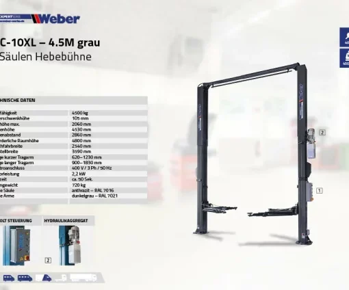 - zulässige Tragkraft 4500 kg, die Struktur der Hebebühne wurde erfolgreich dynamisch mit einer Last von 115 % des zulässigen Gesamtgewichts sowie statisch mit 150 % des zulässigen Gesamtgewichts getestet