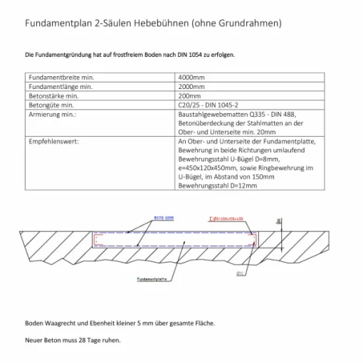 - Bodenanforderung nach aktueller (in Deutschland zulässiger) Statik, Beton C20/25 DIN1045:2001-D7 doppelt armiert mit einer Ausdehnung von min. 4000 x 2000 x 200 mm