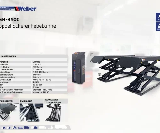 - zulässige Tragkraft 3500 kg, die Struktur der Hebebühne wurde erfolgreich dynamisch mit einer Last von 115 % des zulässigen Gesamtgewichts sowie statisch mit 150 % des zulässigen Gesamtgewichts getestet