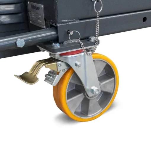 - drehbare, große Laufrollen mit Feststellbremse an den vorderen Laufrollen