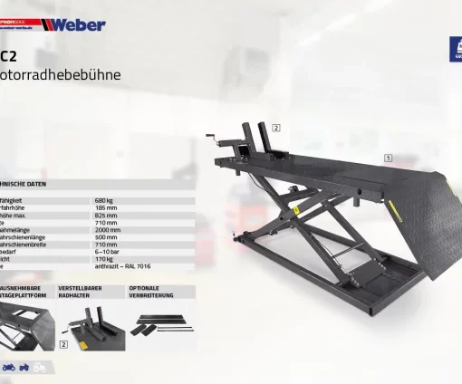 - Heben und Senken per lufthydraulischem Aggregat (Fußpumpenbetrieb möglich)